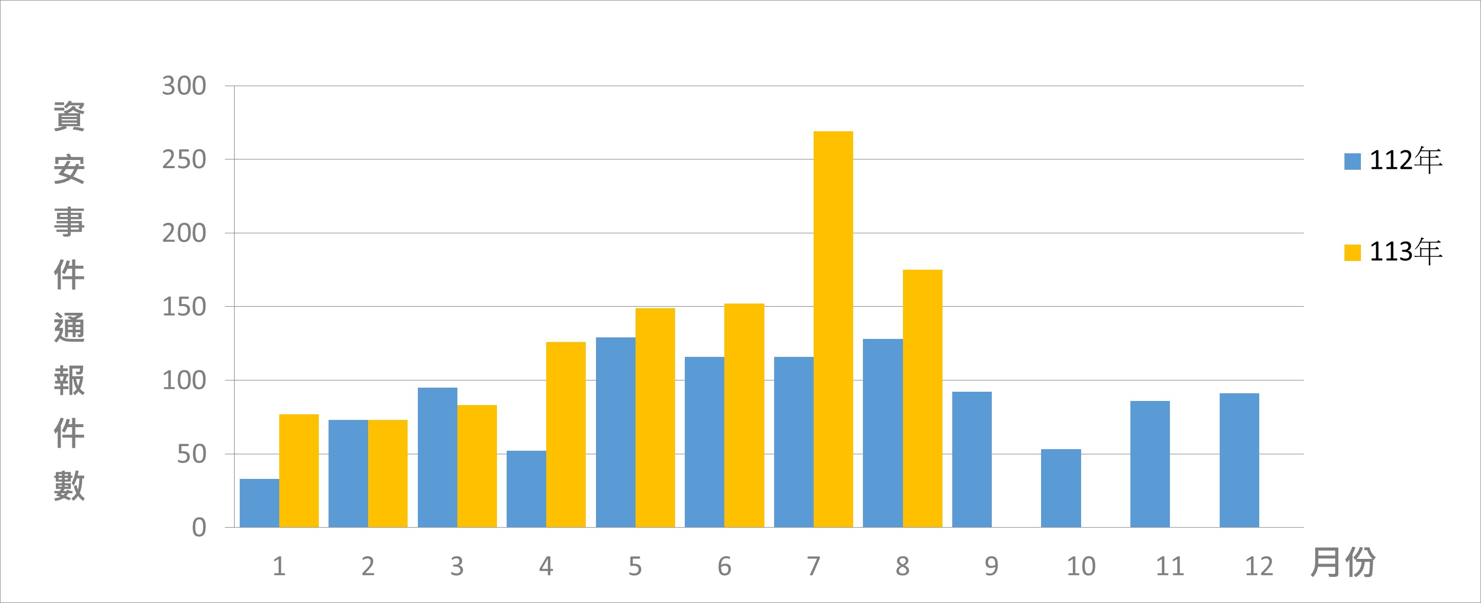 本月資安事件通報數量共175件(較上月減少101件),較去年同期增加0.36倍,主要係實兵演練攻擊成功案件較多。近1年資安事件通報統計,詳見圖2。