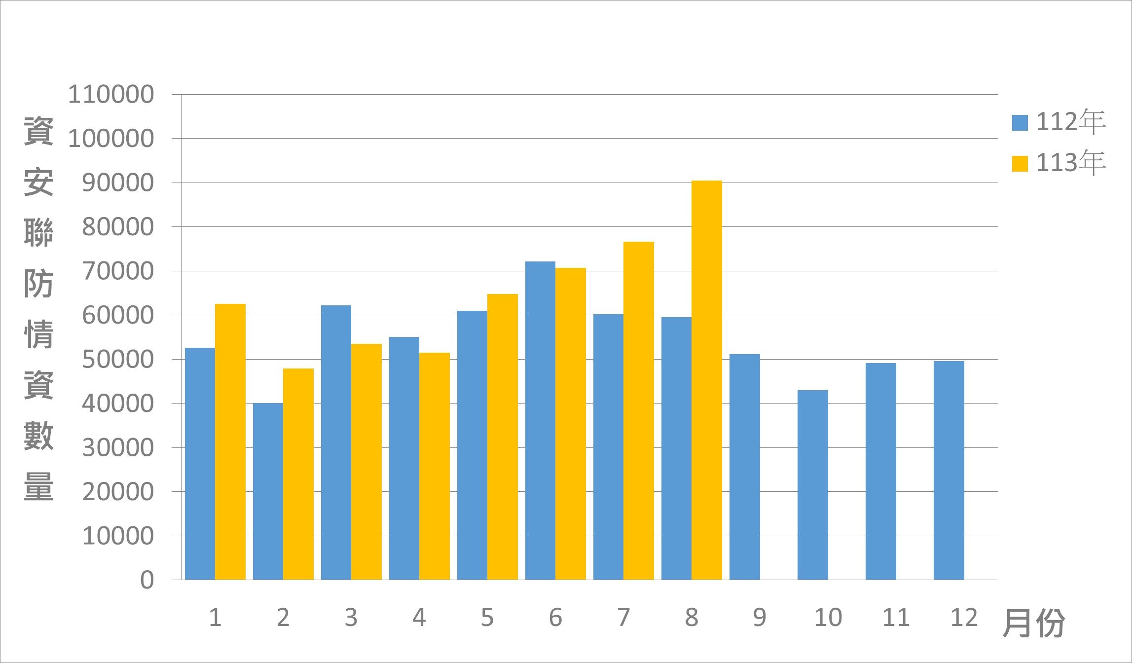 本月蒐整政府機關資安聯防情資共9萬510件(較上月增加1萬3,938件),主要係近期偵測發現惡意程式增多(增加逾9,000件),惟現行資安機制已成功阻擋大部分惡意行為;分析可辨識的威脅種類,第1名為資訊蒐集類(38%),主要是透過掃描、探測及社交工程等攻擊手法取得資訊;其次為入侵攻擊類(23%),大多是系統遭未經授權存取或取得系統/使用者權限;以及惡意程式類(17%),主要係偵測主機疑似進行惡意程式連線或下載行為。統計近1年情資數量分布,詳見圖1。