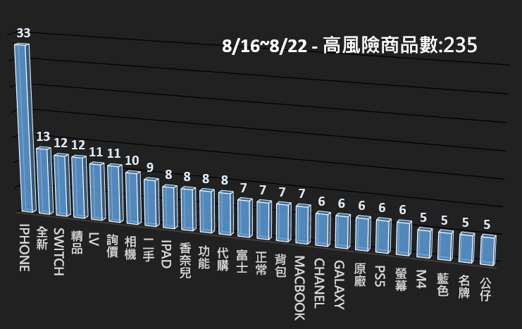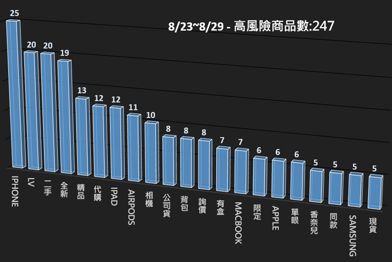 本署電商防詐雷達本週(8/23~8/29)共掃瞄22,572筆電商平台商品,發現其中247筆為高風險商品,並已提供相關資訊給電商平台進行預防性下架,以降低消費者接觸詐騙商品的風險。