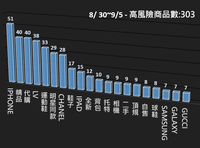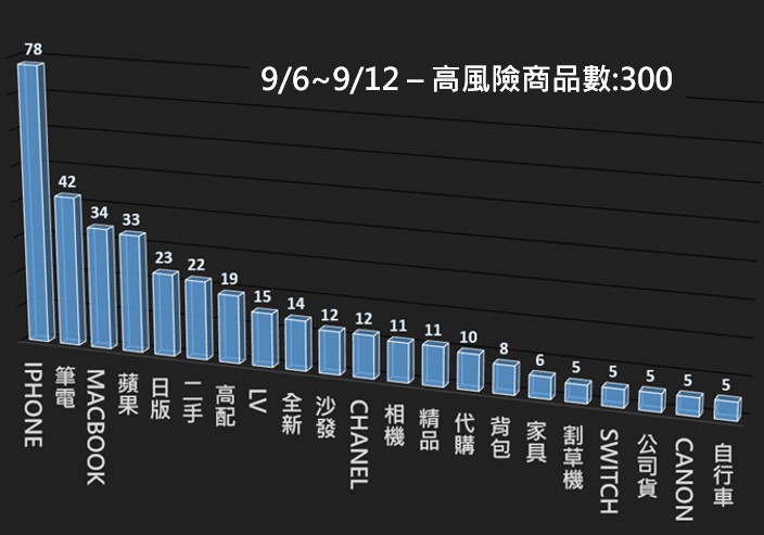 本署電商防詐雷達本週(9/20~9/26)共掃瞄22,355筆電商平台商品,發現其中240筆為高風險商品,並已提供相關資訊給電商平台進行預防性下架,以降低消費者接觸詐騙商品的風險。