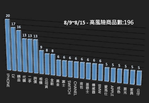 本署電商防詐雷達本週(8/9~8/15)共掃瞄22,269筆電商平台商品,發現其中196筆為高風險商品,並已提供相關資訊給電商平台進行預防性下架,以降低消費者接觸詐騙商品的風險。