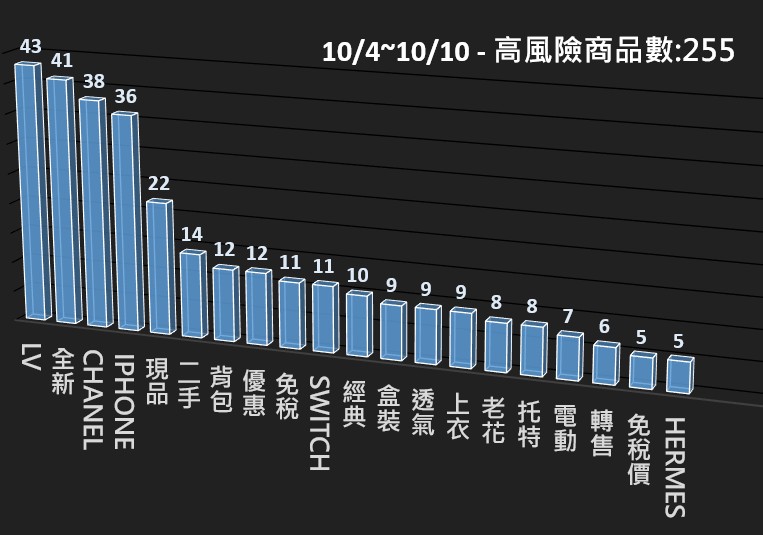 本署電商防詐雷達本週(10/4~10/10)共掃瞄21,450筆電商平台商品,發現其中255筆為高風險商品,並已提供相關資訊給電商平台進行預防性下架,以降低消費者接觸詐騙商品的風險。