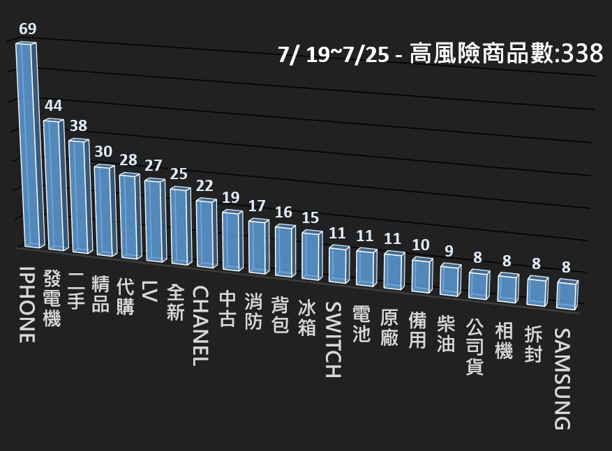 本署電商防詐雷達本週(7/19~7/25)共掃瞄22,603筆電商平台商品,發現其中338筆為高風險商品,並已提供相關資訊給電商平台進行預防性下架,以降低消費者接觸詐騙商品的風險。