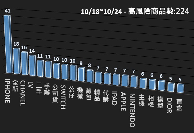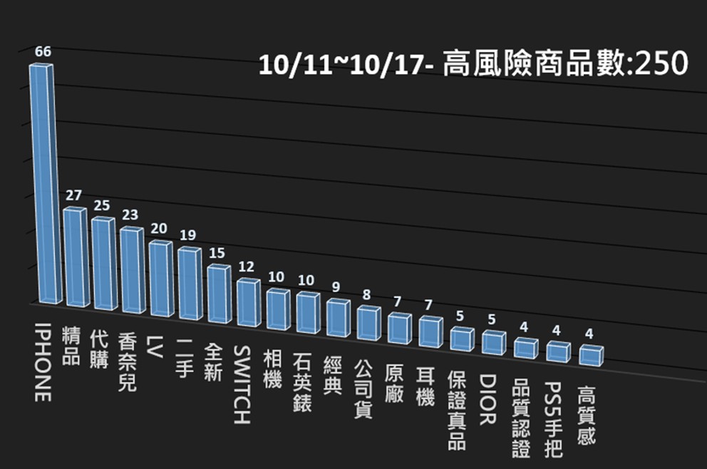 本署電商防詐雷達本週(10/11~10/17)共掃瞄20,393筆電商平台商品,發現其中250筆為高風險商品,並已提供相關資訊給電商平台進行預防性下架,以降低消費者接觸詐騙商品的風險。