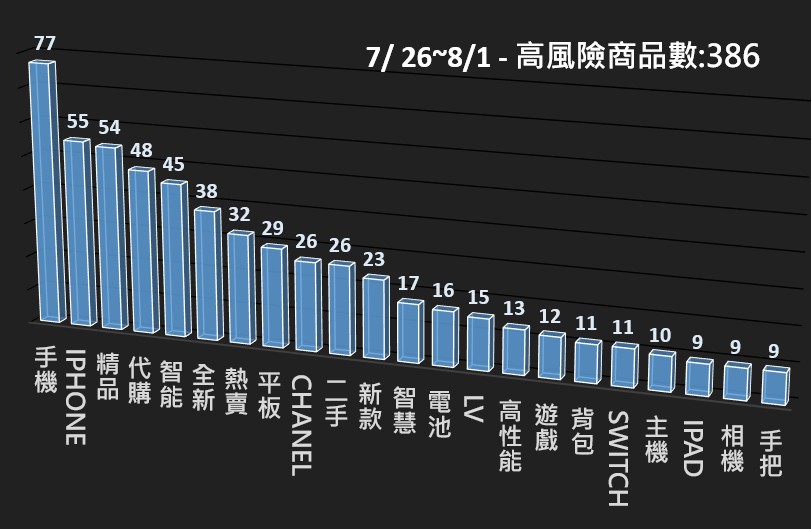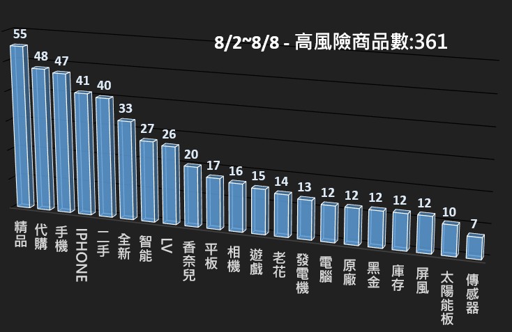 本週高風險商品主要多為「手機」、「精品」、與「遊戲機」類別,常見的高風險關鍵字包含「代購」、「二手」,顯示精品、3C消費電子與代購市場仍是詐騙風險較高的領域。尤其正值暑假開學前,民眾對於手機、平板、筆電等高價3C商品的需求增加,賣家也多以「二手」、「中古」「拆封」等字樣提供低於一般售價吸引消費者。消費者在購買相關商品時,應對於與一般售價差異過多之商品多一分警覺,不要貪小便宜,並特別留意賣家評價與匯款交易方式,避免遭遇詐騙。