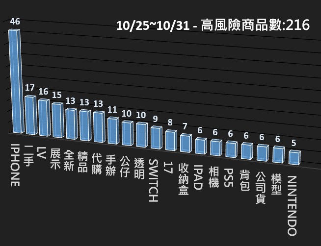 本署電商防詐雷達本週(10/25~10/31)共掃瞄21,022筆電商平台商品,發現其中216筆為高風險商品,並已提供相關資訊給電商平台進行預防性下架,以降低消費者接觸詐騙商品的風險。