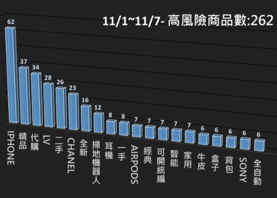 本署電商防詐雷達本週(11/1~11/7)共掃瞄21,693筆電商平台商品,發現其中262筆為高風險商品,並已提供相關資訊給電商平台進行預防性下架,以降低消費者接觸詐騙商品的風險。