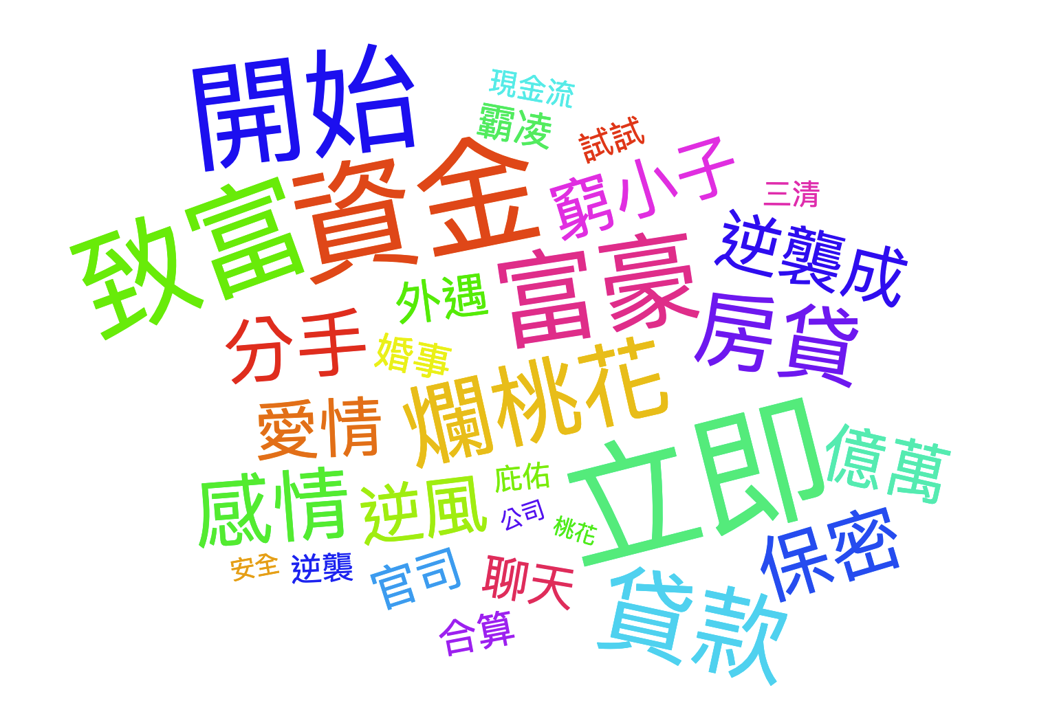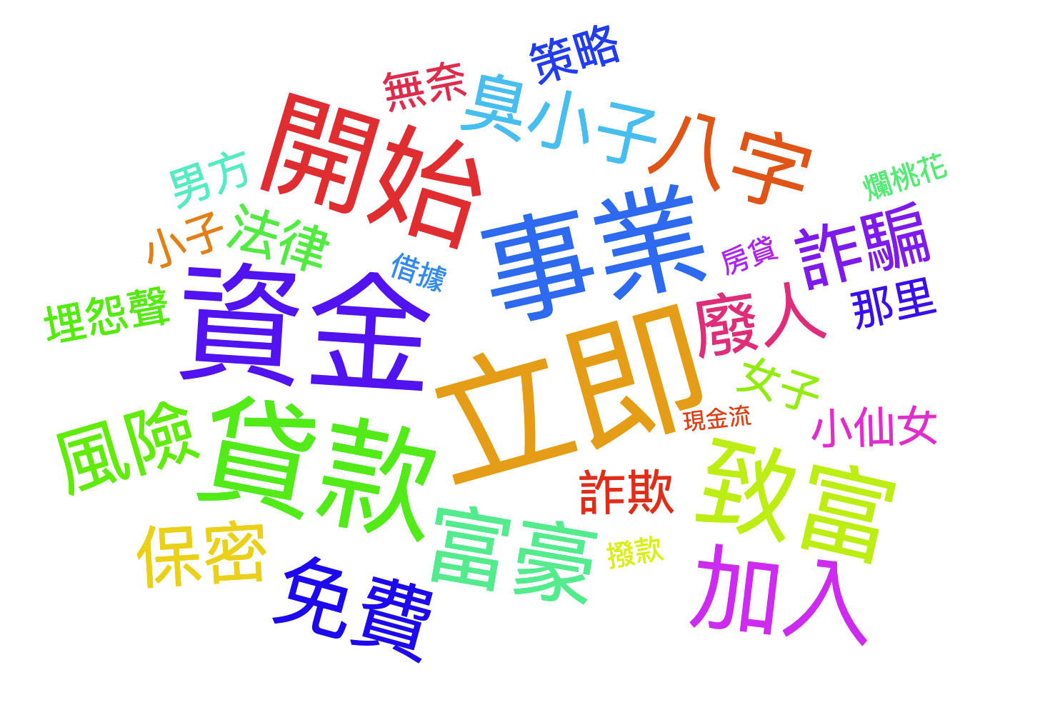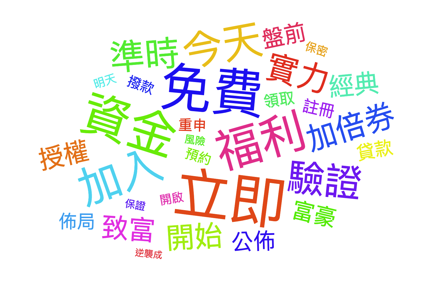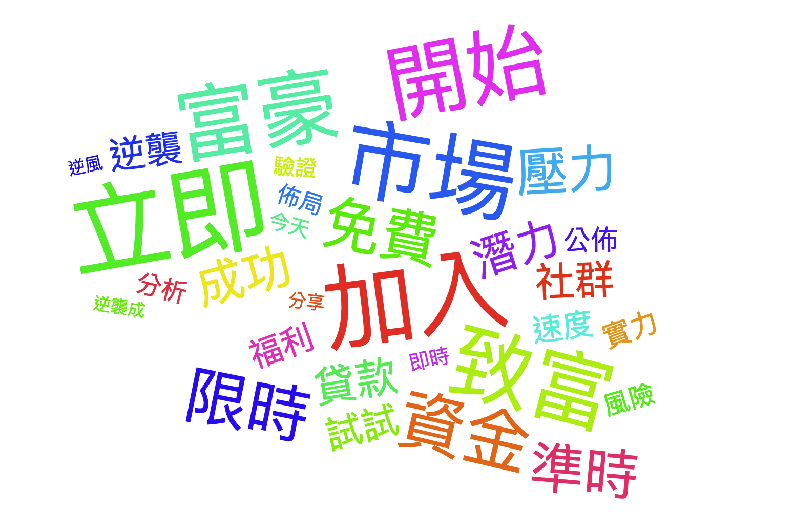 高頻的關鍵字包括:「致富」、「富豪」、「潛力」、「市場」、「佈局」、「逆襲」、「億萬」等,常見詐騙話術如:立即開始致富旅程、逆襲當富豪。