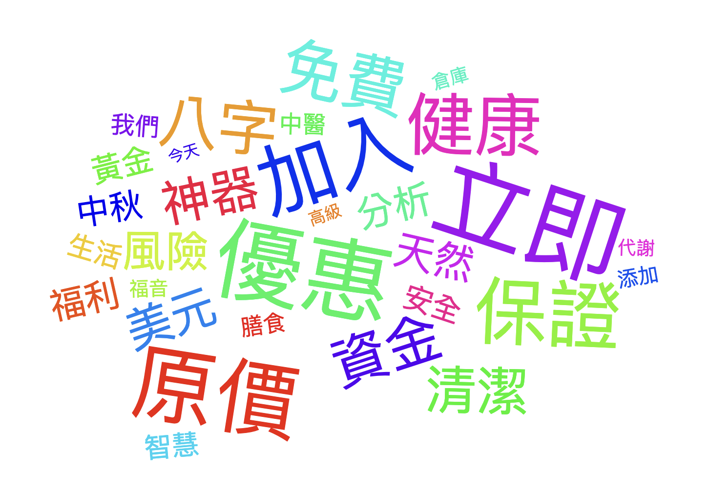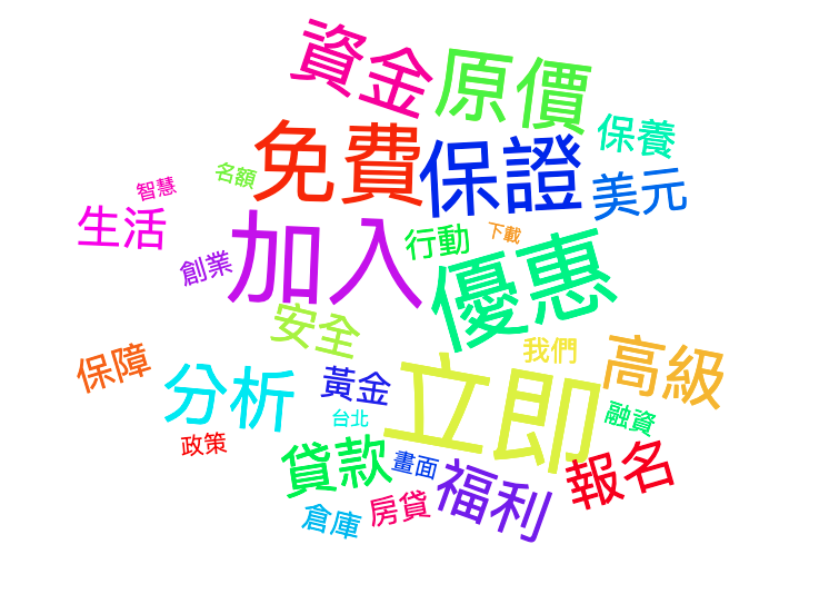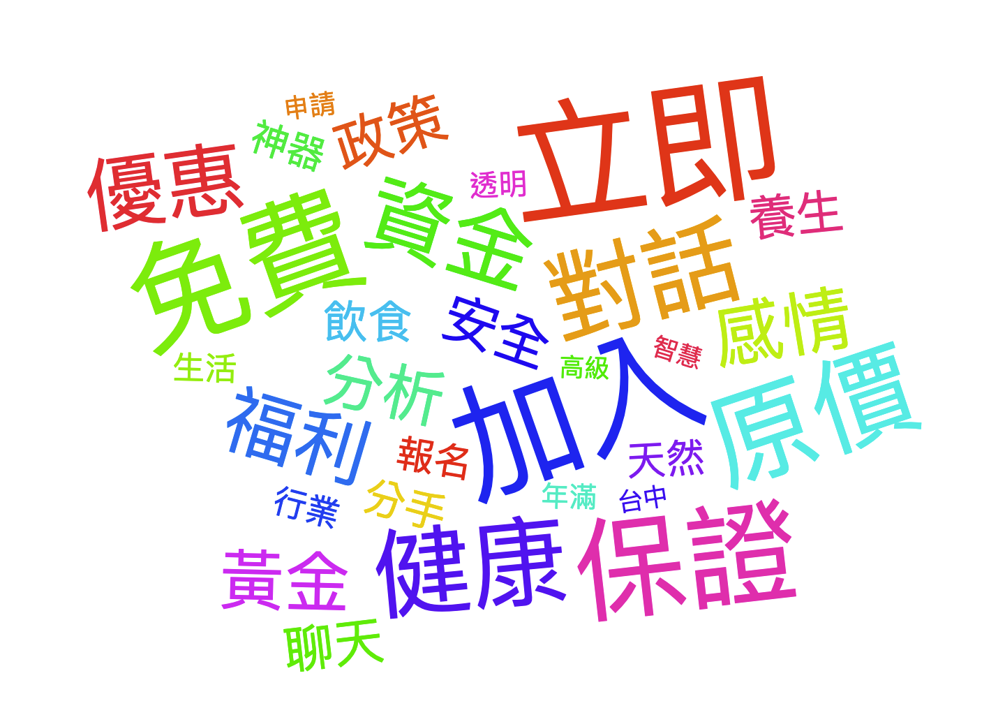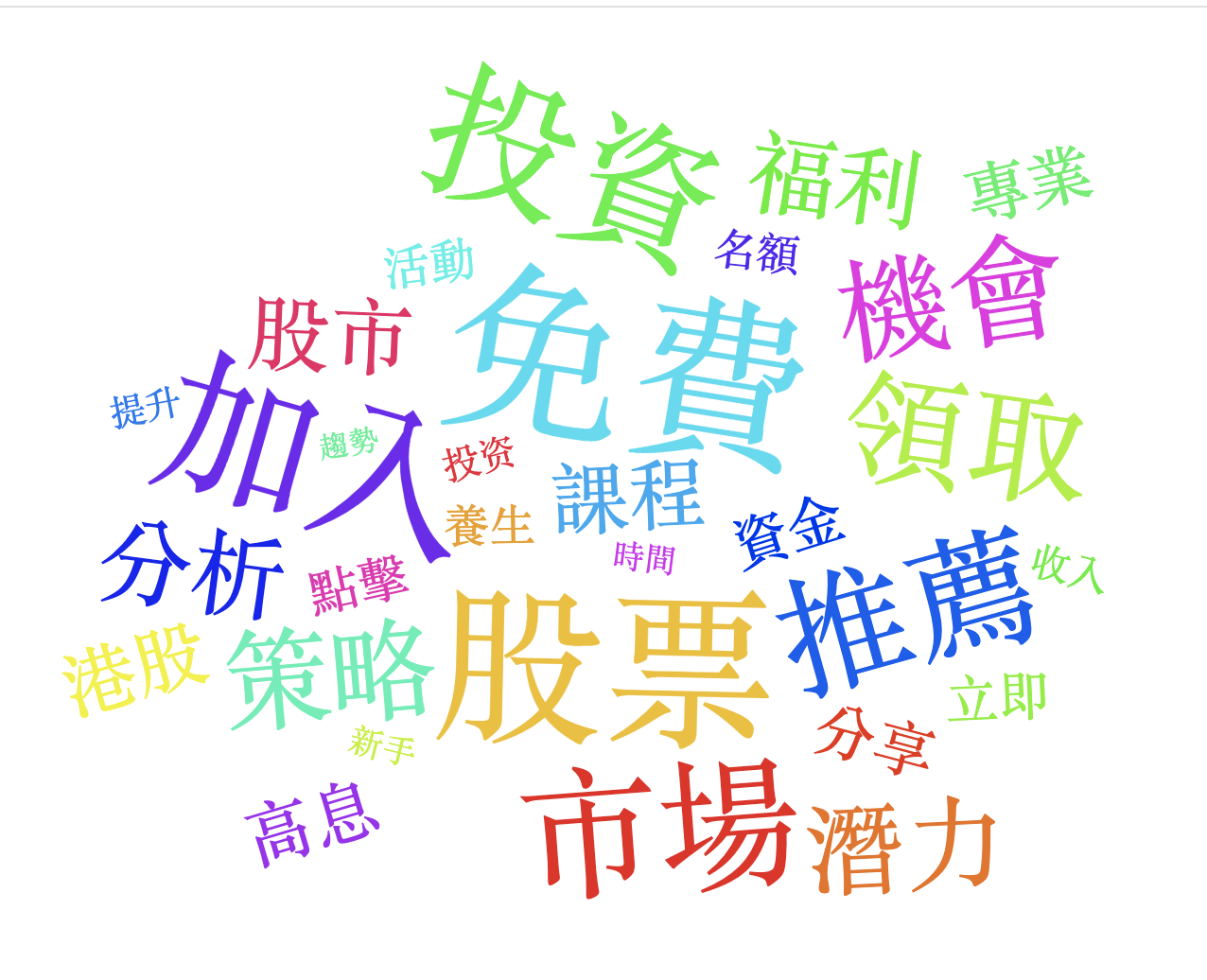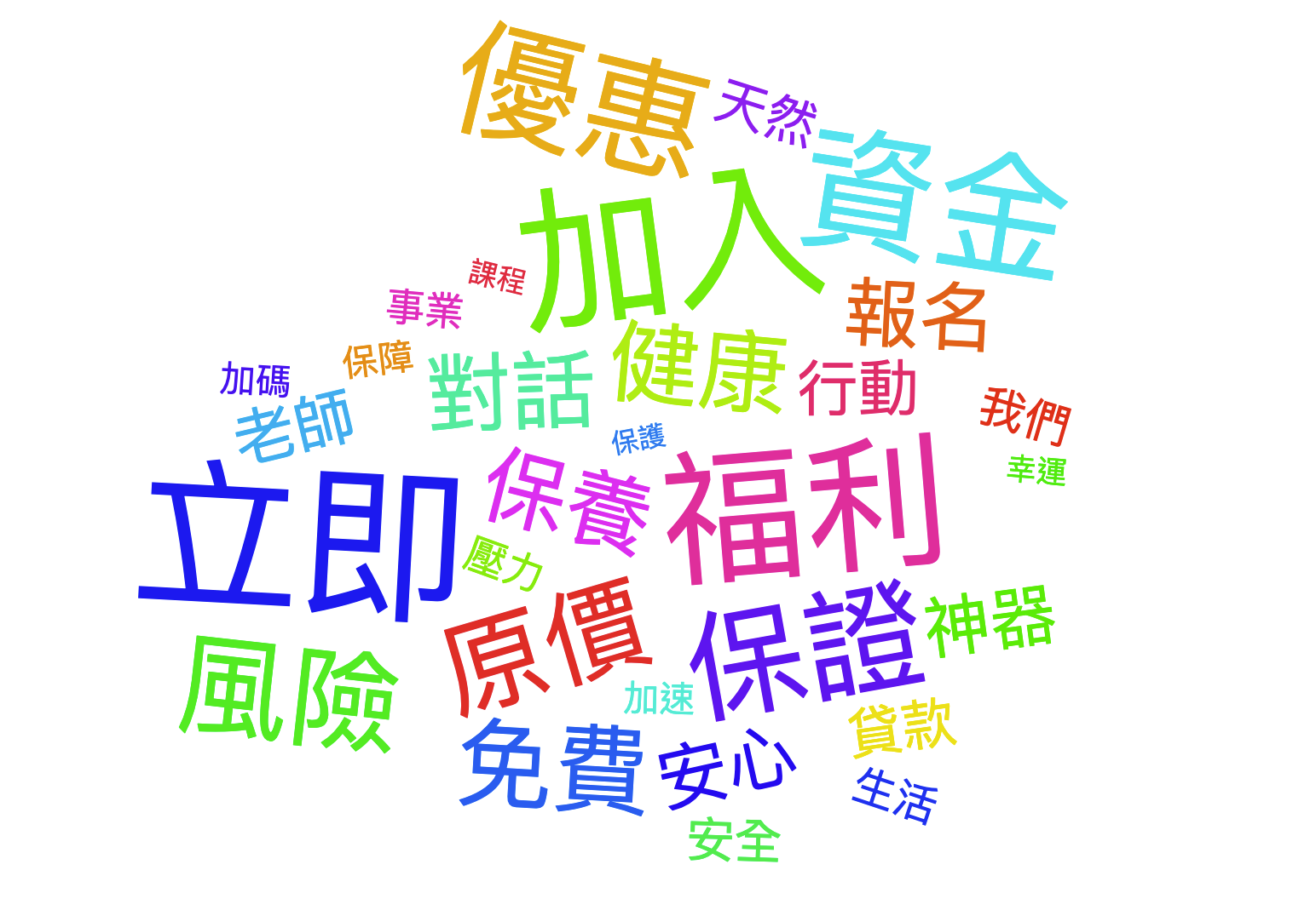 高頻的關鍵字包括:「致富」、「富豪」、「潛力」、「市場」、「佈局」、「逆襲」、「億萬」等,常見詐騙話術如:立即開始致富旅程、逆襲當富豪。