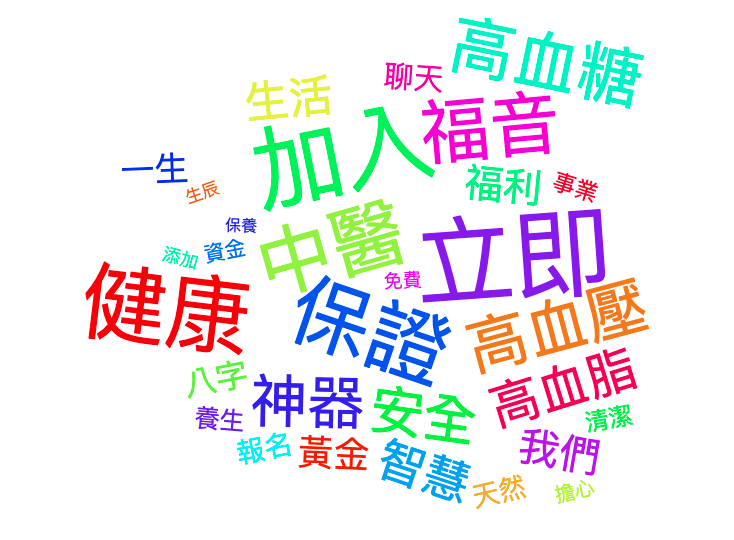 本週(10/18~10/24)關鍵字顯示,健康養生與中醫話術全面升溫:以「健康/中醫/養生/天然」結合「高血糖/高血壓/高血脂」,再搭「免費/報名/福音」吸睛。另有「八字/生辰」情感命理,以及各式居家清潔「神器」導購。