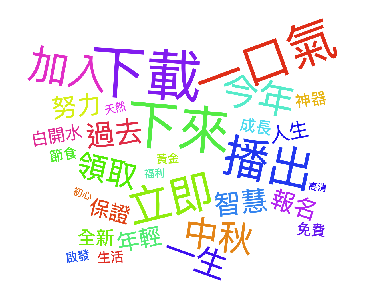 本週(10/4~10/10)詐騙關鍵字顯示下列幾大主軸:「下載/播出/一口氣/高清」帶動的影視 App 引流詐騙;以「免費/報名/福利/天然」包裝的健康減重與保健商品推銷;「一生/人生/啟發」等字詞出現在命理課程與心靈勵志類詐騙;「中秋」優惠話術也持續延燒。