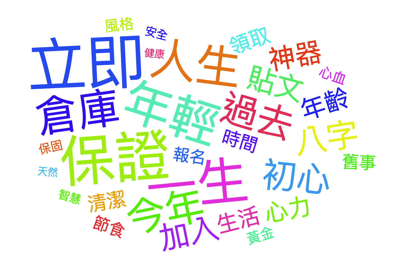 保健、瘦身與清潔用品持續活躍,以「天然、安全、無副作用」為主軸,搭配「神器、黃金比例、快速見效」等誇大形容。
