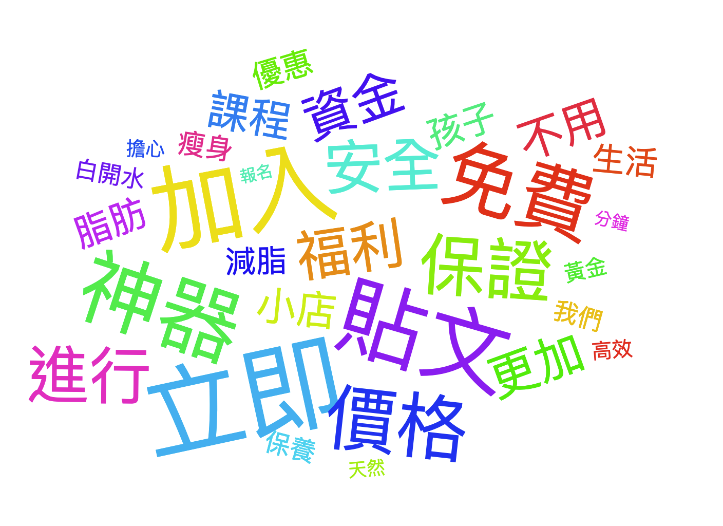 本週特別出現「神器」、「脂肪」、「白開水」、「安全」、「保證」等關鍵字,詐騙訊息透過誇張話術宣稱使用一次即可見效、脂肪快速減少且對身體安全有保障、0痛感等誇大效果,例如:白開水加下去服用就可以快速有效減脂,皆為典型誇大不實廣告。