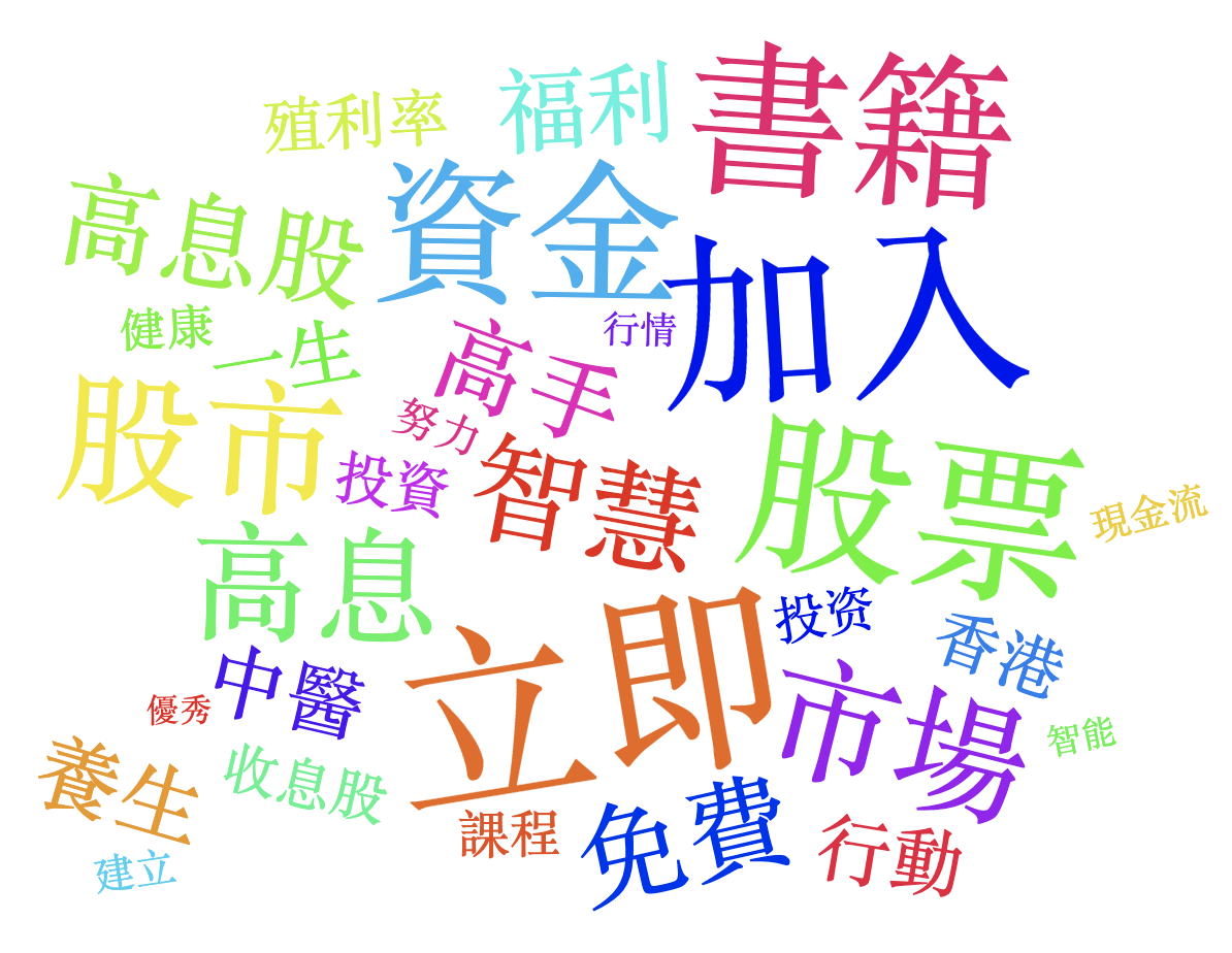 「加入」、「免費」、「準時」、「今天」、「驗證」等詞,用來強調安全的社群,可以放心驗證成果,如:立即加入、免費退出、每天早上9點準時推送潛力標、今天佈局,明天驗證。
