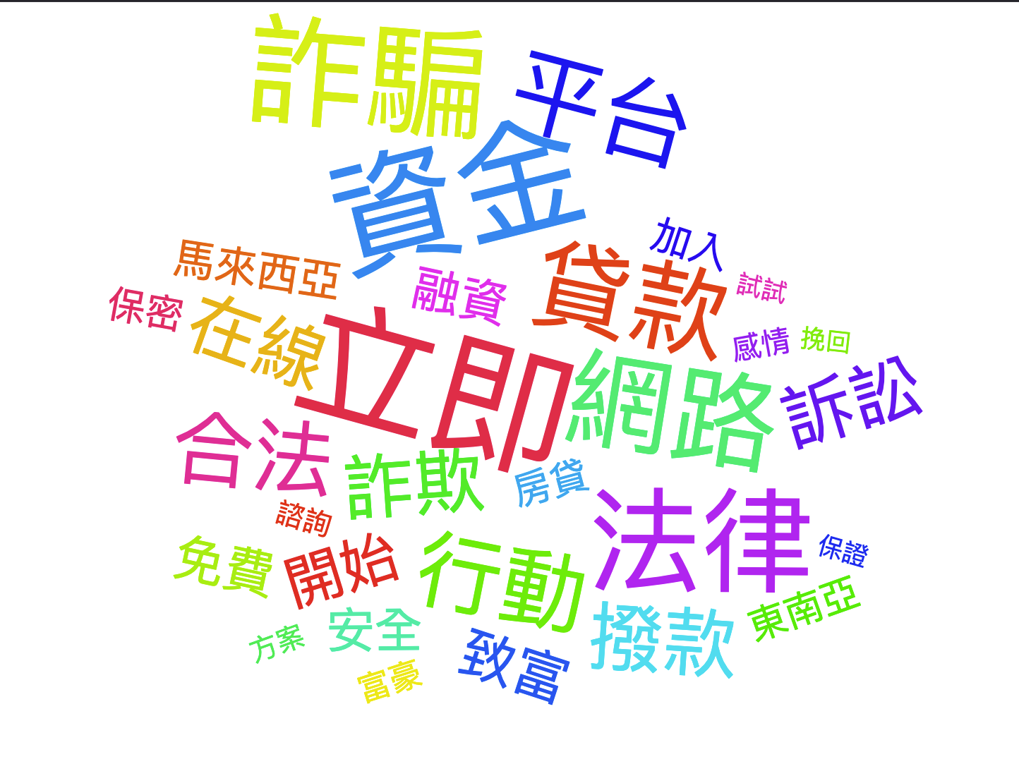本週(8/9~8/15)詐騙關鍵字排名顯示,本週新出現的關鍵字與詐騙情境為「馬來西亞」、「東南亞」等跨國投資房產話術,原本的「資金」、「貸款」、「撥款」、「融資」等資金需求詐騙仍持續進榜。而詐騙集團近期強打「合法」、「法律」、「訴訟」、「詐欺」這類型的法律援助、反詐追款的包裝,誘導受害者在二次詐騙中再度受害。再加上「感情」、「挽回」、「諮詢」等情感服務型詐騙,類型相當多元。