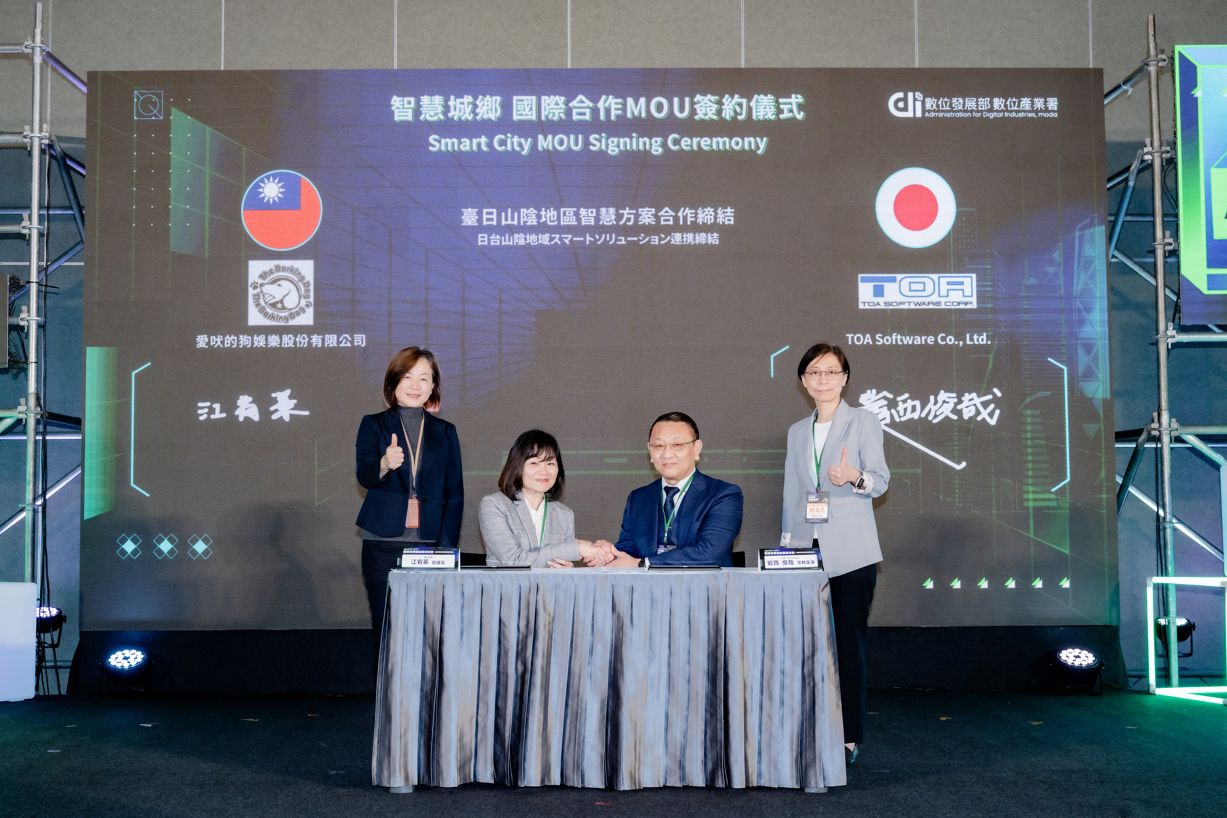數位發展部數位產業署今(19)日於南港展覽館二館舉辦「2026智慧城鄉創新匯流沙龍暨創業歸故里授證典禮」,匯聚智慧城鄉服務業者及40家「創業歸故里」的獲獎團隊,共同分享智慧科技於地方場域的應用成果。現場更傳來兩項跨國合作捷報,首先,在數產署黃雅萍副署長及比利時駐台代表馬徹(Matthieu Baudouin A. Branders)的見證下,臺灣數位照護業者「先進醫資」與比利時商「Dermatoo」正式簽署合作協議;另在數產署黃雅萍副署長及資策會林玉凡副執行長的見證下,臺灣數位互動科技業者「愛吠的狗娛樂股份有限公司」亦與日商「TOA Software Co., Ltd.(東亞ソフトウェア株式會社)」完成合作簽署,充分展現臺灣智慧城鄉解決方案輸出國際的競爭力。
