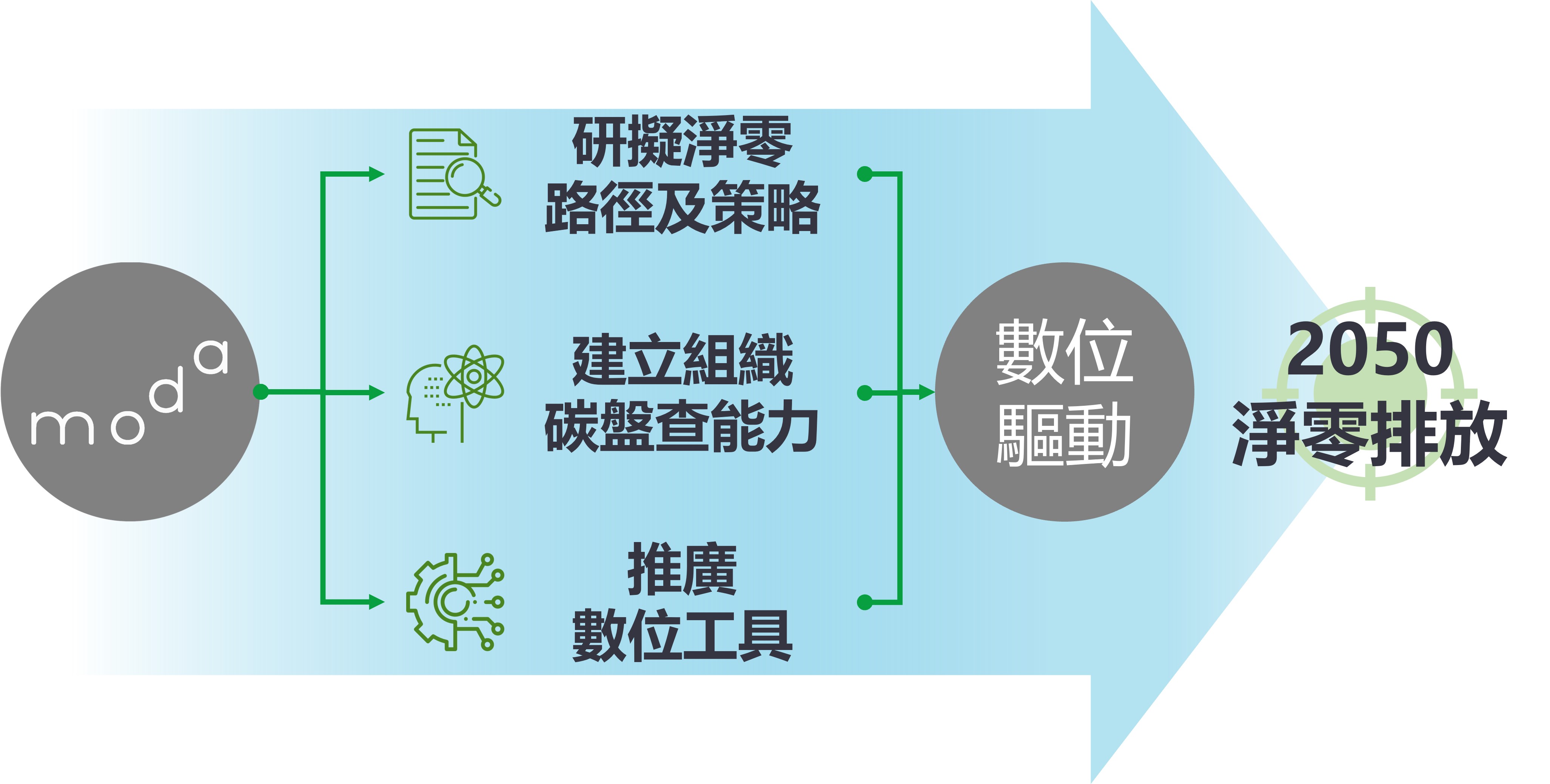 遵循我國「2050淨零排放」目標,研擬本部與相關產業之淨零發展路徑及策略;提升淨零認知及碳盤查能力;另為提倡資訊透明及開放原始碼理念,以公私協力方式發展可行之數位工具及機制,協助公私部門展現數位、淨零轉型驅動力。