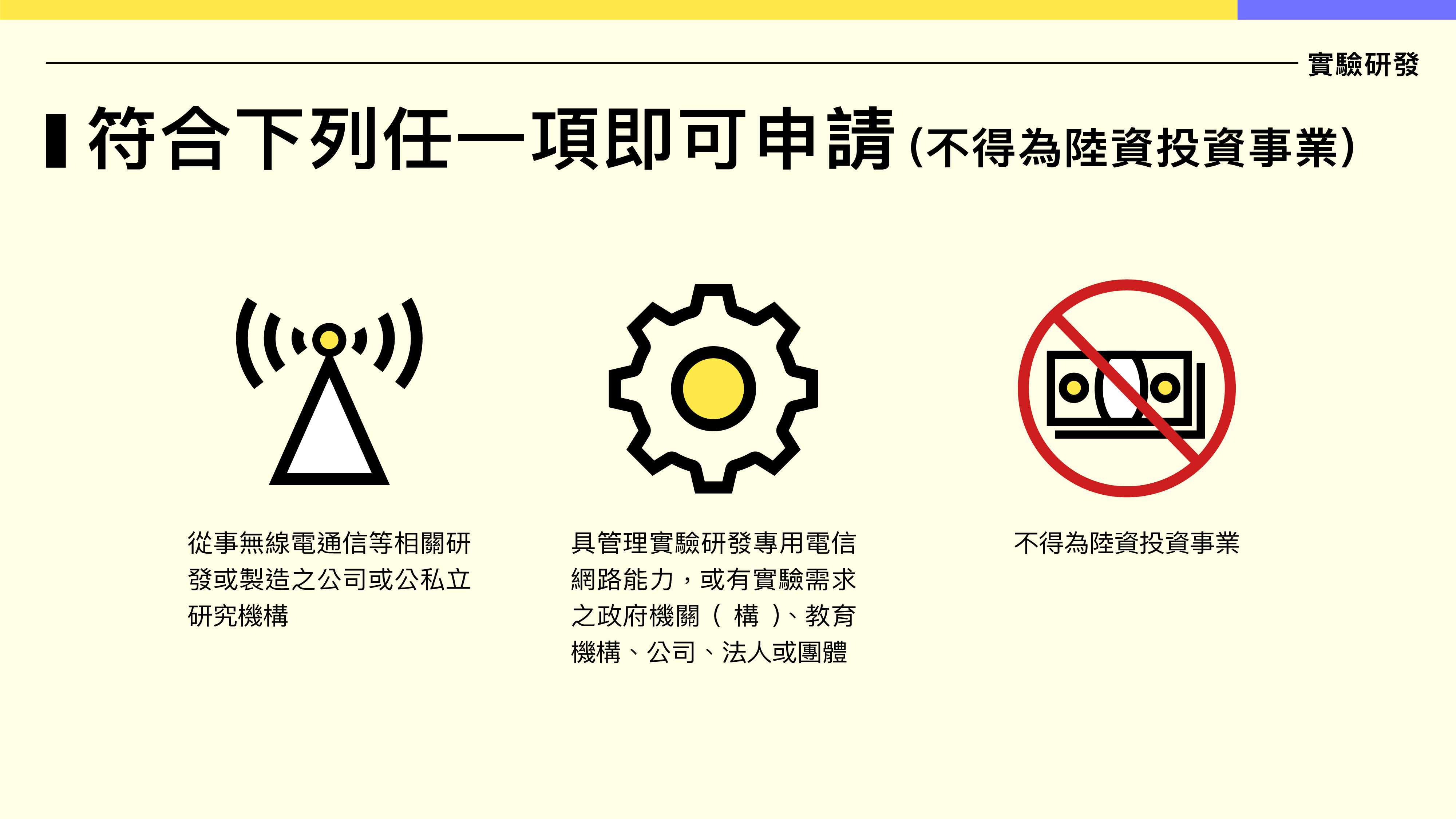 1. 從事電信網路、無線電通信等相關研發或製造之公司或公私立研究機構