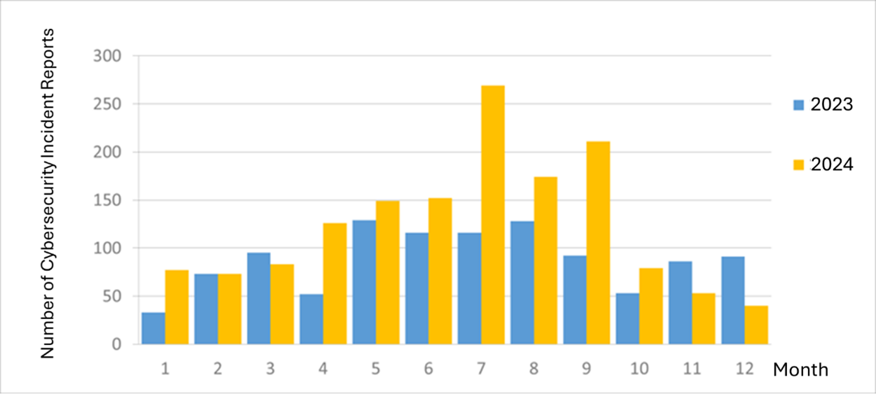 The number of cybersecurity incident reports totaled 40 this month (a decrease of 13 from the previous month), a 0.44-fold decrease compared to the same period last year. This month, it was found that some government IT equipment connected to malicious relay stations, downloaded malicious programs, or generated connections with features of data-stealing software and other malicious programs, which accounted for 47.5% of the total number of reports. The statistics of cybersecurity incident reports in the past year are as shown in Figure 2.