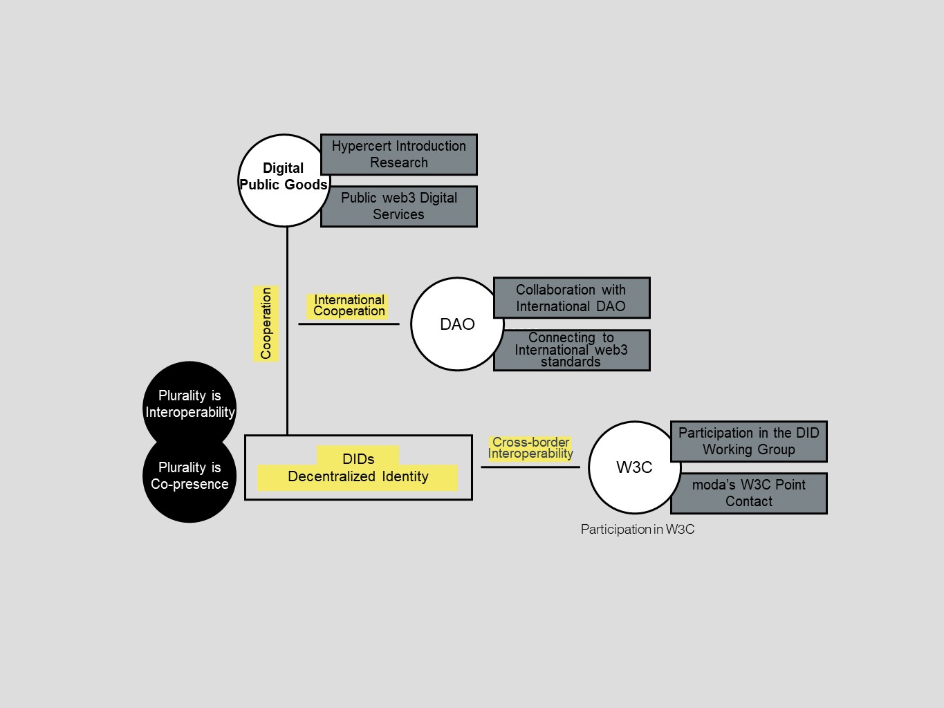 Based on the principles of "interoperability and co-presence," the moda is driving the development of digital public infrastructure with a foundation in decentralized autonomous organizations (DAOs) and decentralized identities. Our aim is to enhance international participation in decentralized organizations and align with global standards, thereby achieving goals such as digital democracy, Smart Taiwan, and data democratization.