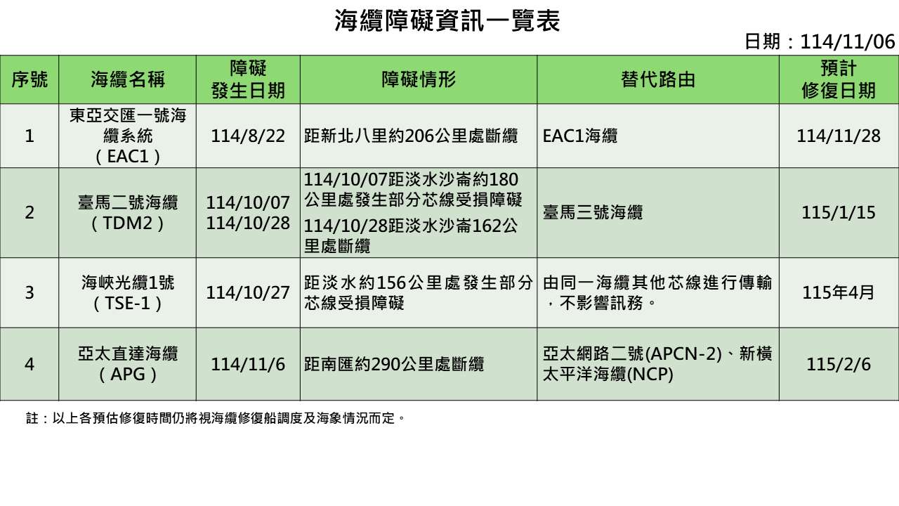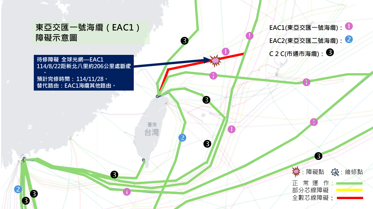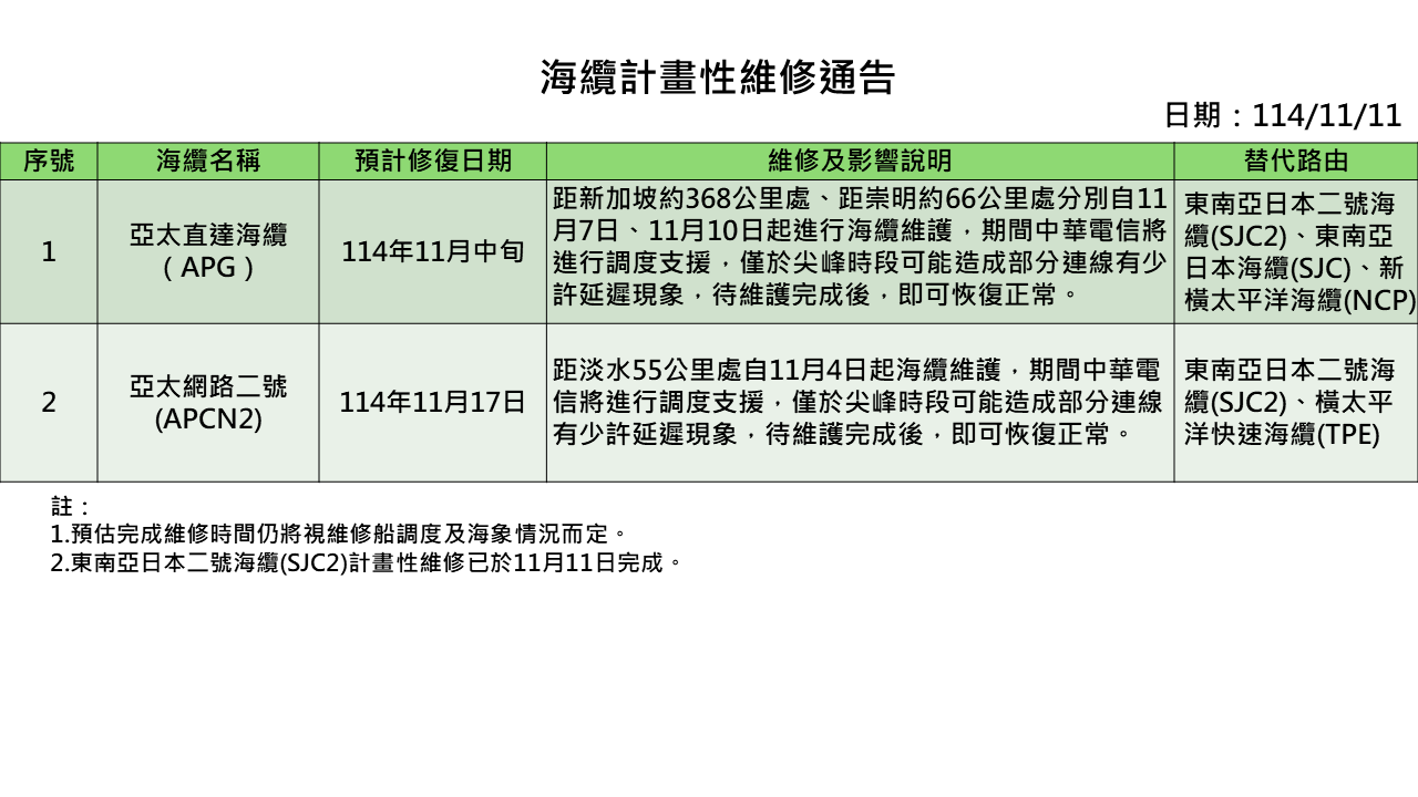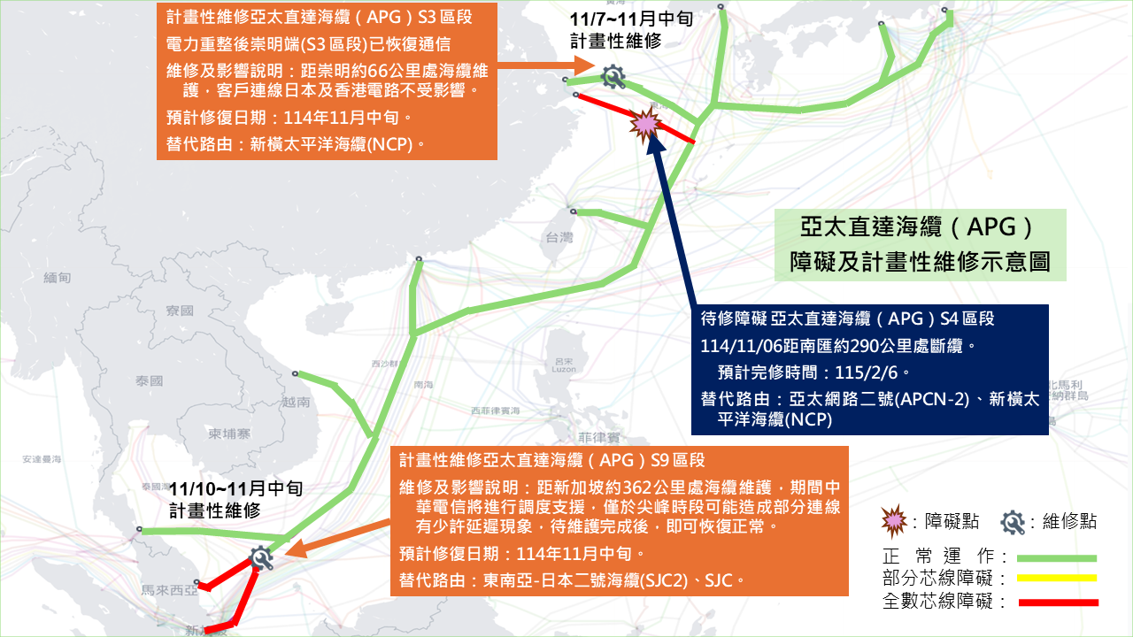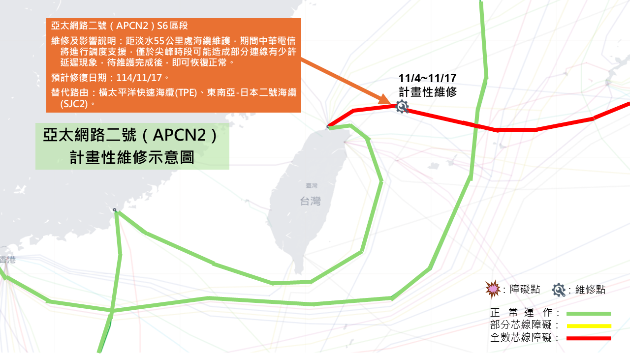 六、亞太直達海纜障礙及計畫性維修示意圖:中華電信公告https://www.hinet.net/notifyPage.html?id=199ebf6baa9000001134&type=0