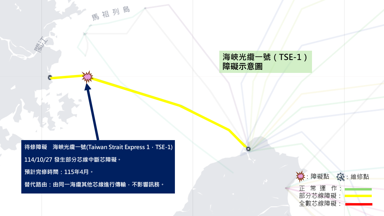 114/10/27 距淡水約156公里處發生部分芯線受損障礙 由同一海纜其他芯線進行傳輸,不影響訊務。 115年4月