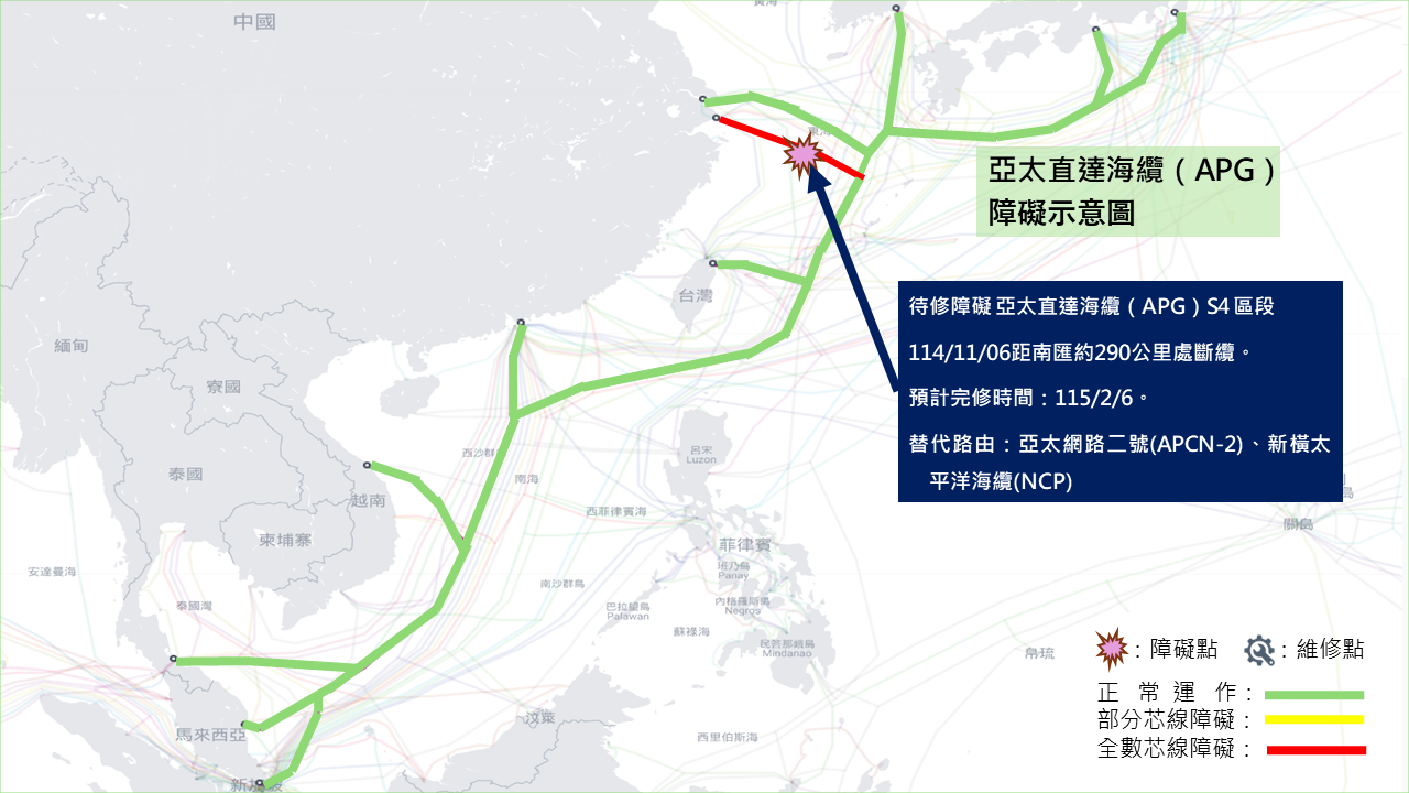 114/11/6 距中國南匯約290公里處斷纜 亞太網路二號 (APCN-2)、新橫太平洋海纜(NCP) 115/2/6