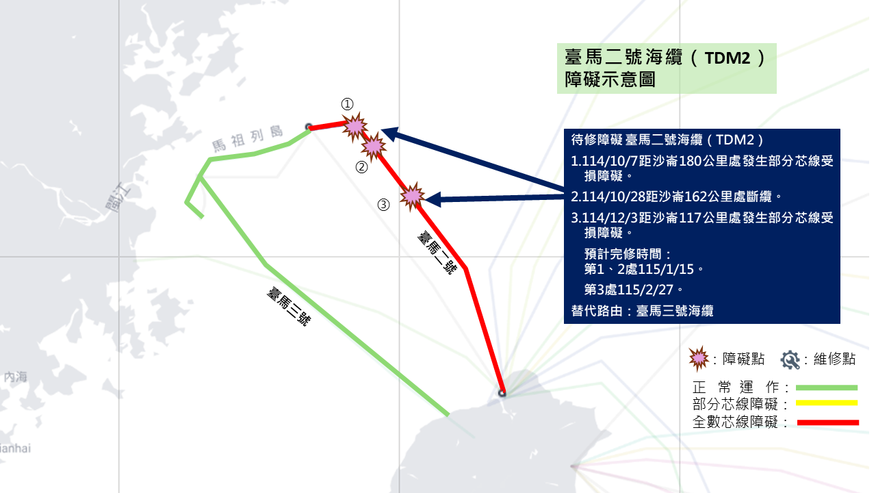 114/10/7 114/10/7距淡水沙崙約180公里處發生部分芯線受損障礙 臺馬三號海纜 115/1/15